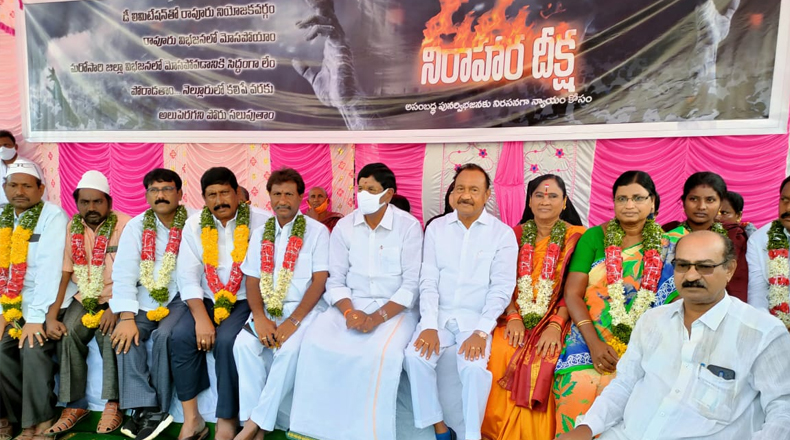 Clock Of Nellore ( Rapur ) – నియోజకవర్గాల పునర్విభజనలో రాపూరు నియోజకవర్గాన్ని పోగొట్టుకుని మోసపోయాం… మరో సారి జిల్లా విభజనలో మోసపోవడానికి సిద్ధంగా లేం… పోరాడతాం… నెల్లూరులో కలిపే వరకూ అలుపెరుగని పోరు సలుపుతాం… అంటూ నిరాహార దీక్షకు పూనుకున్నారు… నెల్లూరుజిల్లాలోని రాపూరు మండల ప్రజా ప్రతినిధులు, ప్రజలు. వెంకటగిరి నియోజకవర్గ పరిధిలోని రాపూరు, కలువాయి, సైదాపురం మండలాలను శ్రీబాలాజీ జిల్లాలో కలపడంపై వారు ఆగ్రహం వ్యక్తం చేస్తున్నారు. 11 రోజుల పాటూ జరిపే నిరాహార దీక్షకు గురువారం శ్రీకారం చుట్టారు. బుధవారం మూడు మండలాల ప్రజా ప్రతినిధులతో జిల్లా కలెక్టర్ చక్రధర్ బాబును కలిసి వినతి పత్రం సమర్పించిన మాజీ మంత్రి, వెంకటగిరి ఎమ్మెల్యే ఆనం రామ నారాయణరెడ్డి వీరి దీక్షకు సంఘీభావం తెలుపుతూ దీక్షలో పాల్గొన్నారు.