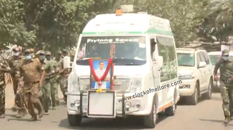 Clock Of Nellore ( Nellore ) – నిన్న హైదరాబాద్ లో గుండెపోటుతో కన్నుమూసిన రాష్ట్ర పరిశ్రమల శాఖ మంత్రి మేకపాటి గౌతమ్ రెడ్డి భౌతిక కాయాన్ని ఇవాళ నెల్లూరులోని వారి నివాసానికి తీసుకొచ్చారు. నిన్న ఉదయం నుండి ఇవాళ ఉదయం వరకూ హైదరాబాద్ లోని వారి నివాసంలో ఉంచగా ఇవాళ ఉదయం బేగంపేట విమానాశ్రయం నుండి భారత వాయుసేన హెలికాప్టర్ లో నెల్లూరుకు తీసుకొచ్చారు. హైదరాబాద్ ఇంటి వద్ద నుండి ఉదయం 7: 45 గంటలకు అంబులెన్స్ లో గౌతమ్ రెడ్డి భౌతిక కాయాన్ని బేగంపేట విమానాశ్రయానికి తీసుకెళ్లారు. తర్వాత 9: 45 గంటలకు అక్కడి నుండి హెలికాప్టర్ నెల్లూరుకు బయలుదేరింది. ఉదయం 11: 52 గంటలకు హెలికాప్టర్ నెల్లూరులోని పోలీసు కవాతు మైదానానికి చేరుకుంది. ప్రత్యేక అంబులెన్స్ ద్వారా సమీపంలోని మేకపాటి గౌతమ్ రెడ్డి నివాసానికి భౌతిక కాయాన్ని తీసుకెళ్లి ప్రజల సందర్శనార్ధం ఉంచారు. మంత్రి అనీల్ కుమార్ యాదవ్ దగ్గరుండి ఏర్పాట్లు పర్యవేక్షిస్తున్నారు. గౌతమ్ రెడ్డిని చివరిసారిగా చూసేందుకు ప్రజలు భారీగా తరలివస్తున్నారు.