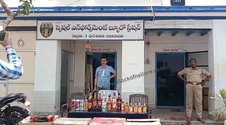 Clock Of Nellore ( Nellore ) – నెల్లూరుజిల్లాలో విదేశీ మద్యంతో పాటూ ఇతర రాష్ట్రాలకు చెందిన మద్యం నిల్వలు భారీగా వెలుగుచూస్తున్నాయి. రెండు నెలల క్రితం కృష్ణపట్నం పోర్టు నుండి తీసుకొచ్చిన విదేశీ మద్యం బాటిళ్లను స్వాధీనం చేసుకుని ఒకర్ని నెల్లూరు స్పెషల్ ఎన్ ఫోర్స్ మెంట్ పోలీసులు అరెస్ట్ చేసిన విషయం తెలిసిందే. తాజాగా నిన్న గోవా నుండి ఓడల ద్వారా భారీగా నెల్లూరులోని మైపాడు బీచ్ వద్ద మద్యం బాటిళ్లను దిగుమతి చేస్తుండగా పోలీసులు గుర్తించి అనేక మందిని అరెస్ట్ చేశారు. లక్షల విలువైన మద్యాన్ని స్వాధీనం చేసుకున్నారు. తాజాగా బుధవారం నెల్లూరు సుబేదారుపేటలోని అనురాధ స్పోర్ట్స్ ఎదురుగా ఉన్న ఓ ఇంటిలో నెల్లూరు సెబ్ పోలీసులు తనిఖీలు నిర్వహించారు. పాండిచ్చేరికి చెందిన మద్యం బాటిళ్లను స్వాధీనం చేసుకున్నారు. అక్రమంగా నిల్వ ఉంచిన 10 లక్షల విలువైన 964 మద్యం బాటిళ్లను స్వాధీనం చేసుకుని, సంగం గ్రామానికి చెందిన కొండా ప్రవీణ్ అనే వ్యక్తిని అరెస్ట్ చేశారు. ఓ ద్విచక్ర వాహనాన్ని కూడా స్వాధీనం చేసుకున్నట్లు సెబ్ పోలీసులు తెలియజేశారు.