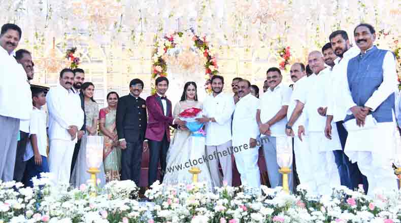Clock Of Nellore ( Nellore ) – ముఖ్యమంత్రి జగన్మోహన్ రెడ్డి ఆదివారం సాయంత్రం నెల్లూరుజిల్లా కావలికి విచ్చేశారు. కావలి ఎమ్మెల్యే రామిరెడ్డి ప్రతాప్ కుమార్ రెడ్డి కుమారుని వివాహ రిసెప్షన్ కు ఆయన హజరయ్యి నూతన వధూవరులకు తన ఆశీర్వాదాలు అందజేశారు. తాడేపల్లి నుండి ప్రత్యేక హెలికాప్టర్ లో కావలి సమీపంలోని గౌరవరం వద్ద ఏర్పాటు చేసిన రిసెప్షన్ ప్రాంతానికి ఆదివారం సాయంత్రం చేరుకున్నారు. అక్కడికి చేరుకున్న సిఎం జగన్ కు ఎమ్మెల్యే రామిరెడ్డి ప్రతాప్ కుమార్ రెడ్డి స్వాగతం పలికారు. అనంతరం వేదికపైకి చేరుకున్న సిఎం జగన్ నూతన వధూవరులకు పుష్ప గుచ్ఛం అందజేసి శుభాకాంక్షలు తెలియజేశారు. ఆయనతో పాటూ జిల్లాకు చెందిన ప్రజాప్రతినిధులు, నేతలు కూడా పాల్గొన్నారు. అనంతరం ఆయన హెలికాప్టర్ లో తాడేపల్లికి బయలుదేరి వెళ్లారు.