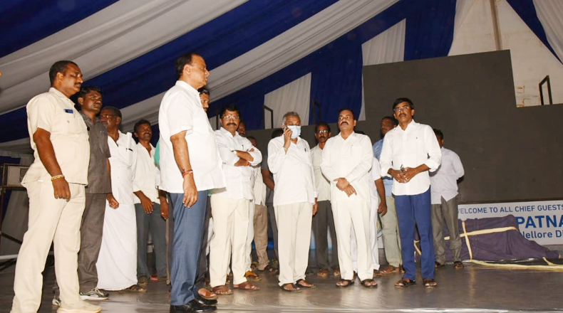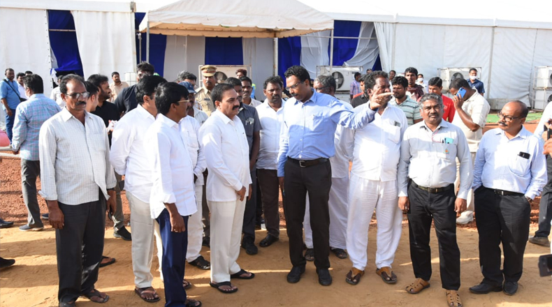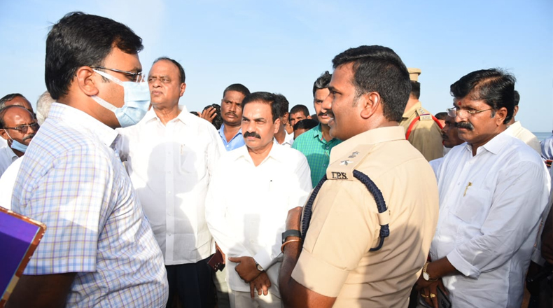 Clock Of Nellore ( Ramaya Patnam ) – ముఖ్యమంత్రి వైఎస్ జగన్ బుధవారం నెల్లూరుజిల్లా రామాయపట్నం పోర్టుకు శంఖుస్థాపన చేయనున్న విషయం తెలిసిందే. ఈ నేపద్యంలో అక్కడి ఏర్పాట్లను మంత్రి కాకాణి గోవర్ధన్ రెడ్డి, రాజ్యసభ సభ్యులు వేమిరెడ్డి ప్రభాకర్ రెడ్డి, కందుకూరు ఎమ్మెల్యే మానుగుంట మహిధర్ రెడ్డి, కావలి ఎమ్మెల్యే రామిరెడ్డి ప్రతాప్ కుమార్ రెడ్డి, జిల్లా కలెక్టర్ చక్రధర్ బాబు, ఎస్పీ విజయరావు పరిశీలించారు. శంఖుస్థాపన శిలాఫలకాన్ని, సభా ప్రాంగణాన్ని పరిశీలించి సిబ్బందికి పలు సూచనలు చేశారు. సిఎం సభను విజయవంతం చేయాలని కాకాణి పిలుపునిచ్చారు. ఎస్పీ ట్రయల్ కాన్వాయ్ ను నిర్వహించారు. పూర్తి స్థాయి పోలీసు బందోబస్తును ఏర్పాటు చేశారు.