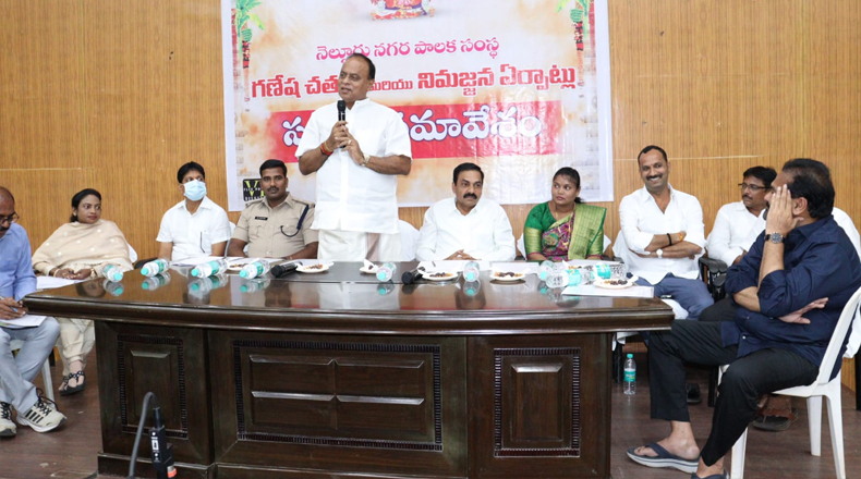 Clock Of Nellore ( Nellore ) – నెల్లూరు నగర వ్యాప్తంగా ఈనెల 31వ తేదీ నుంచి జరుపుకోనున్న వినాయక చవితి ఉత్సవాలను నగర పాలక సంస్థ ఆధ్వర్యంలో అత్యంత ప్రణాళిక బద్ధంగా నిర్వహించేందుకు ఏర్పాట్లను పూర్తి చేస్తున్నామని రాష్ట్ర వ్యవసాయ శాఖ మంత్రి కాకాణి గోవర్ధన్ రెడ్డి పేర్కొన్నారు. నెల్లూరు కార్పొరేషన్ కార్యాలయంలో గణేష్ చతుర్థి, నిమజ్జన ఏర్పాట్లపై ప్రజా ప్రతినిధులు, అధికారులతో సమీక్షా సమావేశాన్ని గురువారం నిర్వహించారు. రూరల్ శాసన సభ్యులు కోటంరెడ్డి శ్రీధర్ రెడ్డి అధ్యక్షతన జరిగిన ఈ సమావేశంలో మంత్రి గోవర్ధన్ రెడ్డి మాట్లాడుతూ ప్రతీ ఏటా నిమజ్జనం నిర్వహించే పెన్నా నది రంగనాయకుల పేట వద్ద కాకుండా ఈ ఏడాది ఇరుకళల పరమేశ్వరి అమ్మవారి దేవస్థానం సమీపంలో నెల్లూరు చెరువు ఘాట్ లో ఏర్పాటు చేస్తున్నామని తెలిపారు. పండుగ నిర్వహణలో ఆసక్తి చూపే యువతకు ప్రోత్సాహంగా విగ్రహాల ఏర్పాటుకు పోలీస్ శాఖ అనుమతులు మంజూరు చేయాలని సూచించారు. ఇళ్ల మధ్యలో ఉండే మండపాల వద్ద భారీ సౌండ్లు, సాంస్కృతిక కార్యక్రమాలు లేకుండా సమీపంలోని బహిరంగ ప్రదేశాల్లో నిర్వహించుకునేలా అనుమతులు ఇవ్వాలని తెలిపారు. మండపాల వద్ద, నిమజ్జనం ప్రదేశంలో విద్యుత్ అంతరాయం లేకుండా ఆ శాఖ వారు జాగ్రత్తలు వహించాలని మంత్రి సూచించారు. ఘాట్ రిపేరు పనులు, చెరువులో గుర్రపు డెక్క ఆకు తొలగింపు, రోడ్డు మార్గాల నిర్మాణం వంటి అభివృద్ధి పనులను వెంటనే ప్రారంభించాలని అధికారులను ఆదేశించారు. నిమజ్జనానికి 4 భారీ క్రేన్ లను వినియోగించాలని, రేపటి నుంచే నిమజ్జన ట్రయల్ రన్ పనులు ప్రారంభించాలని సూచించారు. వినాయక ఉత్సవాల నిర్వహణకు నుడా, మంత్రి, ఎమ్మెల్యే, ఎంపీ నిధులను వినియోగించనున్నామని, అదేవిధంగా జిల్లా కలెక్టర్ కూడా నిధులు మంజూరు చేసేలా కోరుతామని తెలిపారు.