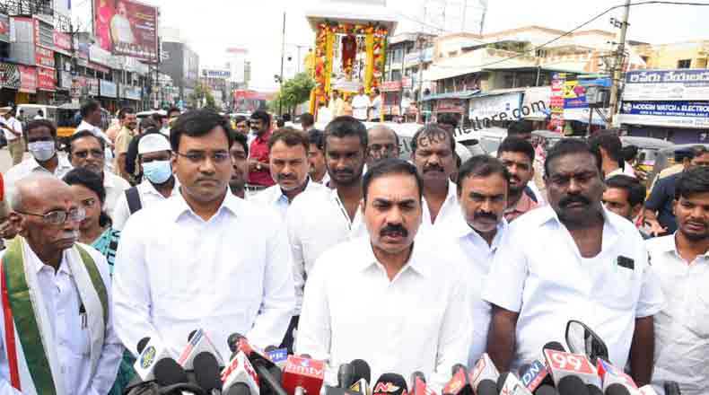 Clock Of Nellore ( Nellore ) – నెల్లూరులో మహాత్మాగాంధీ జయంతి వేడుకలు ఘనంగా జరిగాయి. పలువురు ప్రజా ప్రతినిధులు, అధికారులు, వివిధ పార్టీల నేతలు గాంధీ విగ్రహాలకు, చిత్ర పటాలకు ఘనంగా నివాళి అర్పించి ఆయన చూపిన మార్గంలో పయనించాలని పిలుపునిచ్చారు. నగరంలోని ట్రంకురోడ్డులో ఉన్న గాంధీ విగ్రహానికి రాష్ట్ర వ్యవసాయ శాఖ మంత్రి కాాకాణి గోవర్ధన్ రెడ్డి పూలమాలలు వేసి నివాళి అర్పించారు. ఆయనతో పాటూ జిల్లా కలెక్టర్ చక్రధర్ బాబు, జాయింట్ కలెక్టర్ కూర్మనాథ్, నెల్లూరు కార్పొరేషన్ కమిషనర్ హరిత తదితరులు కూడా గాంధీకి నివాళి అర్పించారు. గాంధీ జయంతి సందర్భంగా నగరంలోని జెట్టి శేషారెడ్డి కళ్యాణ మండపంలో వ్యవసాయ శాఖ అధికారుల అసోసియేషన్ ఆధ్వర్యంలో ఏర్పాటు చేసిన రక్తదాన శిభిరాన్ని మంత్రి కాకాణి గోవర్ధన్ రెడ్డి ప్రారంభించారు. ఆయనతో పాటూ కలెక్టర్ చక్రధర్ బాబు కూడా ఉన్నారు. నెల్లూరు మాగుంట లే అవుట్ లో ఉన్న వైసీపి జిల్లా కార్యాలయంలో గాంధీ జయంతి వేడుకలు జరిగాయి. రాజ్యసభ సభ్యులు, వైసీపి జిల్లా అధ్యక్షులు వేమిరెడ్డి ప్రభాకర్ రెడ్డి ఆధ్వర్యంలో జరిగిన ఈ వేడుకలకు నెల్లూరు రూరల్ ఎమ్మెల్యే కోటంరెడ్డి శ్రీధర్ రెడ్డి, నగర డిప్యూటీ మేయర్ రూప్ కుమార్ యాదవ్ తదితరులు హాజరయ్యి గాంధీ చిత్రపటానికి నివాళి అర్పించారు. నెల్లూరు కార్పొరేషన్ కార్యాలయంలో జరిగిన కార్యక్రమంలో మేయర్ స్రవంతి, కమిషనర్ హరిత, డిప్యూటీ మేయర్ రూప్ కుమార్ యాదవ్ గాంధీ చిత్రపటానికి నివాళి అర్పించారు. జిల్లా ఎస్పీ విజయరావు జిల్లా పోలీసు కార్యాలయంలో గాంధీ చిత్ర పటానికి పూలమాలలు వేసి ఘనంగా నివాళి అర్పించారు. నగరంలోని తెలుగు దేశం పార్టీ జిల్లా కార్యాలయంలో ఆ పార్టీ నేత సోమిరెడ్డి చంద్రమోహన్ రెడ్డి ఆధ్వర్యంలో గాంధీ జయంతి వేడుకలు జరగ్గా నేతలు గాంధీ చిత్రపటానికి నివాళి అర్పించారు.