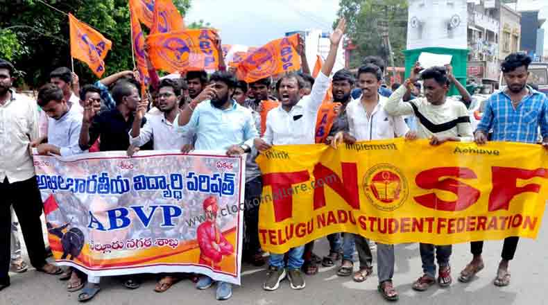 Clock Of Nellore ( Nellore ) – అనంతపురం JNTU పరిధిలోని బీ ఫార్మసీ విద్యార్ధులకు నష్టం కలిగించే విధంగా ప్రభుత్వం యత్నిస్తుందని తెలుగు నాడు స్టూడెంట్స్ ఫెడరేషన్ ( TNSF ), అఖిల భారత విద్యార్ధి పరిషత్ ( ABVP ) ధ్వజమెత్తాయి. విద్యార్ధులకు న్యాయం చేయాలని కోరుతూ నేతలు నెల్లూరులో ఆందోళన నిర్వహించారు. నగరంలోని విఆర్సీ సెంటర్ లో రెండు విద్యార్ధి సంఘాల నేతలు ధర్నా నిర్వహించారు. ఈ సందర్భంగా TNSF జిల్లా అధ్యక్షులు షేక్ అమ్రుల్లా మాట్లాడుతూ ప్రభుత్వం విద్యా దీవెన నిధులను మిగుల్చుకునేందుకు డీటెండ్ అమలు చేస్తుందన్నారు. బీ ఫార్మసీ కోర్సులో భాగంగా మొదటి సంవత్సరంలో సబ్జెక్టులు మిగిలితే… ఎలాంటి షరతులు లేకుండా రెండో సంవత్సరానికి ప్రమోట్ చేసేవారని, రెండో ఏడాది పరీక్షల్లో మొదటి ఏడాది తప్పిన సబ్జెక్టుల పరీక్షలు రాసేవారన్నారు. తాజాగా JNTU అధికారులు మొత్తం సబ్జెక్టులు పూర్తయితే తర్వాత ఏడాదికి ప్రమోట్ చేస్తామని ఉత్తర్వులు జారీ చేసిందని, దీని వల్ల 2700 మంది బీ ఫార్మసీ విద్యార్ధులు నష్టపోయే పరిస్థితి ఉందన్నారు. రాష్ట్రంలోని ఏ యూనివర్శిటీలో ఈ విధానం లేదన్నారు. కేవలం విద్యా దీవెన నిధులు మిగుల్చుకునేందుకు ప్రభుత్వం ఈ చర్యలకు పాల్పడిందని అమ్రుల్లా విమర్శించారు. తక్షణం డీటెండ్ విధానాన్ని వెనక్కు తీసుకోవాలని లేదంటే యూనివర్శిటీని ముట్టడిస్తామని హెచ్చరించారు.