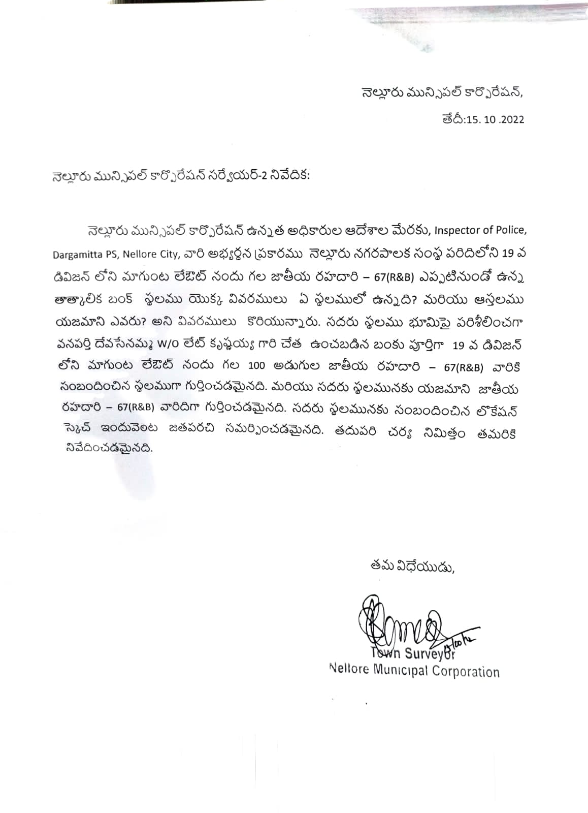 అంత వరకూ బాగానే ఉన్నా తాజాగా ఈ వివాదం ” U ” టర్న్ తీసుకుంది. పోలీసుల విజ్ఞప్తి మేరకు నెల్లూరు మున్సిపల్ కార్పొరేషన్ సర్వే అధికారులు ఆ స్థలంపై పోలీసులకు వివరణ ఇచ్చారు. ఆ మహిళ బంకు పెట్టుకుని ఉన్న స్థలం వేణుగోపాల స్వామి దేవస్థానంకు చెందింది కాదని, అది ఆర్ అండ్ బి మినీ బైపాస్ రోడ్డుకు చెందిన స్థలం అని అధికారికంగా లేఖ అందించింది. అధికారులు అందించిన లేఖ నేపద్యంలో ఈ వివాదం ఎక్కడకు దారి తీస్తుందో వేచి చూడాల్సి ఉంది.