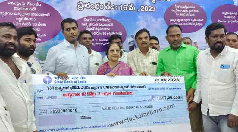 Clock Of Nellore ( Nellore ) – నెల్లూరు జిల్లాలో 12,072 మంది అర్హులైన మత్స్యకార కుటుంబాలు వైయస్సార్ మత్స్య కార భరోసా పథకం క్రింద లబ్ది పొందారని జిల్లా పరిషత్ చైర్ పర్సన్ ఆనం అరుణమ్మ తెలిపారు. రాష్ట్ర ముఖ్యమంత్రి జగన్ మోహన్ రెడ్డి మంగళవారం 1లక్షా 23 వేల మంది కి 123 కోట్ల రూపాయలు బటన్ నొక్కి మత్స్యకారుల ఖాతాలో జమ చేశారు. నెల్లూరు కలెక్టర్ కార్యాలయ తిక్కన ప్రాంగణం నుండి జడ్పీ చైర్ పర్సన్ ఆనం అరుణమ్మ , జిల్లా కలెక్టర్ హరి నారాయణన్ వర్చువల్ గా ఈ కార్యక్రమంలో పాల్గొన్నారు. అనంతరం ఆనం అరుణమ్మ విలేకరులతో మాట్లాడుతూ నెల్లూరు జిల్లాలో 12072 మంది మత్స్యకారులు 12 కోట్ల 7 లక్షల లబ్ది పొందారని ఆమె అన్నారు. మత్స్యకార కుటుంబాలకు వేట నిషేధ బృతిని ఈ ప్రభుత్వం 2019 నుండి 4 వేల నుండి 10వేలకు పెంచిందని ఆమె పేర్కొన్నారు. మత్స్యకారుల సంక్షేమం కోసం కుటుంబానికి 10 వేల ఆర్థిక సహాయం అందజేసినందుకు ముఖ్యమంత్రికి ధన్యవాదాలు తెలియజేశారు. ఈ కార్యక్రమంలో మత్స్యశాఖ సంయుక్త సంచాలకులు ఎం నాగేశ్వరరావు, ఏడీలు విజయ కృష్ణ, శ్రీనివాసరావు తదితరులు పాల్గొన్నారు.