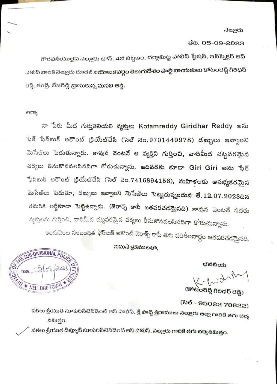 Clock Of Nellore ( Nellore ) – నెల్లూరు రూరల్ ఎమ్మెల్యే కోటంరెడ్డి శ్రీధర్ రెడ్డి సోదరుడు, టిడిపి నేత కోటంరెడ్డి గిరిధర్ రెడ్డి పేరుతో కొందరు నకిలీ ఫేస్ బుక్ అకౌంట్ ను క్రియేట్ చేశారు. నకిలీ ఫేస్ బుక్ ద్వారా పలువురికి మెసేజులు పెడుతూ డబ్బులు కావాలంటూ అడుగుతున్నారు. అంతే కాకుండా మహిళలకు అసభ్యకరంగా మెసేజులు పెడుతున్నారని కూడా తెలిసింది. కొందరు మిత్రుల ద్వారా ఈ విషయాన్ని తెలుసుకున్న కోటంరెడ్డి గిరిధర్ రెడ్డి మంగళవారం దర్గామిట్ట పోలీసులకు ఫిర్యాదు చేశారు. 9701449978 ఫోన్ నంబర్ ద్వారా నకిలీ అకౌంట్ ను సృష్ఠించిన కొందరు… తన మిత్రుల ఫేస్ బుక్ అకౌంట్లకు డబ్బులు కావాలంటూ మెసేజ్ లు పెడుతున్నారని ఫిర్యాదులో పేర్కొన్నారు. గతంలో కూడా 74168 94156 అనే నంబర్ ద్వారా తన పేరుతో కొందకు నకిలీ అకౌంట్లను సృష్ఠించారని గిరిధర్ రెడ్డి ఫిర్యాదులో పేర్కొన్నారు. దానిపై విచారణ జరిపి నకిలీ అకౌంట్లు సృష్ఠించిన వ్యక్తులపై చర్యలు తీసుకోవాలని కోరారు.