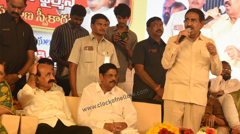 Clock Of Nellore ( Nellore ) – నెల్లూరు అర్బన్ డెవలప్మెంట్ ఆధారిటీ ( నుడా ) ద్వారా జిల్లా సర్వతోముఖాభివృద్ధికి కృషి చేయాలని జిల్లా ఇంచార్జి మంత్రి, రాష్ట్ర న్యాయ, మైనార్టీ శాఖ మంత్రివర్యులు ఎన్ యం డి ఫరూక్ సూచించారు. మంగళవారం నెల్లూరు అర్బన్ డెవలప్మెంట్ ఆధారిటీ చైర్మన్ గా అభిమానుల కేరింతలు, ఆనందోత్సాహాల మధ్య కోటంరెడ్డి శ్రీనివాసుల రెడ్డి ప్రమాణ స్వీకారం చేశారు. తొలుత నగరంలోని నర్తకి సెంటర్ నుండి రాష్ట్ర పురపాలక, పట్టణాభివృద్ధి శాఖ మంత్రి పొంగూరు నారాయణ, నెల్లూరు రూరల్ ఎమ్ ఎల్ ఎ కోటంరెడ్డి శ్రీధర్ రెడ్డి, డిప్యుటీ మేయర్ రూప్ కుమార్ యాదవ్, ఆర్ టి సి జోనల్ చైర్మన్ సురేష్ రెడ్డి తోడుగా అశేష అభిమానులు, వేలాది కార్యకర్తలు వెంట రాగా భారీ ర్యాలీ గా నుడా కార్యాలయంకు కోటంరెడ్డి శ్రీనివాసుల రెడ్డి చేరుకున్నారు. ఈ ప్రమాణ స్వీకార కార్యక్రమానికి విశిష్ట అతిధులుగా రాష్ట్ర దేవాదాయ, ధర్మాదాయ శాఖ మంత్రి ఆనం రామ నారాయణ రెడ్డి , సర్వేపల్లి, ఉదయగిరి, కావలి శాసన సభ్యులు సోమిరెడ్డి చంద్రమోహన్ రెడ్డి, కాకర్ల సురేష్, దగుమాటి వెంకట కృష్ణా రెడ్డి హాజరయ్యారు. అతిధులకు ఘన స్వాగతం పలికిన నెల్లూరు నగర పాలక సంస్థ కమిషనర్, నుడా విసి సూర్య తేజ అనంతరం నుడా చైర్మన్ గా కోటంరెడ్డి శ్రీనివాసుల రెడ్డి చేత ప్రమాణ స్వీకారం చేయించారు.