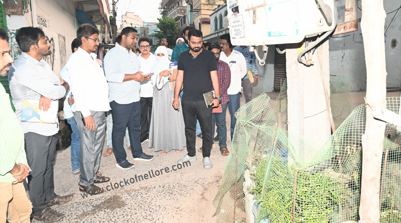 Clock Of Nellore ( Nellore ) – నెల్లూరు నగరపాలక సంస్థ పరిధిలోని అన్ని డివిజన్లలో బహిరంగ ప్రదేశాల్లో వ్యర్ధాలు వేస్తున్న ఫ్లోర్ పాయింట్లను గుర్తించి, ఆయా ప్రాంతాలను శుభ్రపరిచి అక్కడ పూల మొక్కల కుండీలను ఏర్పాటు చేసి రక్షణ కల్పించాలని కమిషనర్ సూర్య తేజ ఆదేశించారు. పారిశుద్ధ్య పనుల పర్యవేక్షణలో భాగంగా మంగళవారం 43వ డివిజన్ కోటమిట్ట, జెండా వీధి, కుమ్మరి వీధి, ఫిష్ మార్కెట్ తదితర ప్రాంతాలలో కమిషనర్ పర్యటించారు. ఈ సందర్భంగా ఆయన మాట్లాడుతూ కోటమిట్ట షాది మంజిల్ ప్రాంతం నుంచి ఏర్పాటు చేసి ఉన్న డివైడర్ పై మొక్కలకు ట్రిమ్మింగ్ చేసి డివైడర్లు శుభ్రంగా ఉంచేలా చర్యలు తీసుకోవాలని సూచించారు. డ్రైను కాలువల్లో పూడికతీత అనంతరం రోడ్లపై సిల్టును ఉంచరాదని, ఎప్పటికప్పుడు తరలించేయాలని ఆదేశించారు. ప్రధానమైన ప్రాంతాల్లో వ్యర్ధాలు వేయకుండా పూల మొక్కల కుండీలను ఫెన్సింగ్ తో పాటు ఏర్పాటు చేసినందుకు స్థానిక శానిటేషన్ సెక్రటరీ, శానిటేషన్ ఇన్ స్పెక్టర్లను కమిషనర్ ప్రశంసించారు. ప్రతి సచివాలయ సెక్రెటరీకి 100 పూలకుండీల మొక్కలను అందజేసి వారి డివిజన్ పరిధిలో ఏర్పాటు చేసుకొనెలా, మొక్కలకు రక్షణ కల్పించేలా ఫెన్సింగ్, క్రమం తప్పకుండా నీటిని పోసే విధంగా ప్రణాళికలు సిద్ధం చేయాలని ఉద్యాన శాఖ అసిస్టెంట్ డైరెక్టర్ ను కమిషనర్ సూచించారు.