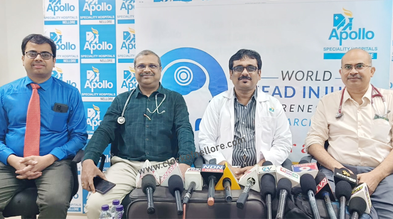 Clock Of Nellore ( Nellore ) – కారణాలు ఏవైనా తలకు బలమైన గాయం తగిలిన వ్యక్తి ప్రాణాలను కాపాడటంలో మొదటి గంట ఎంతో కీలకమని, ఆ గంటలోపు చికిత్స అందకపోతే ప్రతీ సెకనుకు లక్షలాదిగా మెదడు కణాలు చనిపోతూ ఉంటాయని నెల్లూరు అపోలో స్పెషాలిటీ హాస్పిటల్ డైరెక్టర్ మెడికల్ సర్వీసెస్ డాక్టర్ శ్రీరామ్ సతీష్ అన్నారు. నెల్లూరు అపోలో హాస్పిటల్ లో తలకు బలమైన గాయాలు తగిలిన వారికి సత్వరం చికిత్స అందించేందుకు అవసరమైన ఎమర్జెన్సీ మరియు క్రిటికల్ కేర్ విభాగాలు 24 గంటలూ అందుబాటులో ఉంటాయని పేర్కొన్నారు. ప్రపంచ తల గాయాల అవగాహన దినోత్సవం సందర్భంగా గురువారం నెల్లూరులోని అపోలో స్పెషాలిటీ హాస్పిటల్ లో మీడియా సమావేశం జరిగింది. ఈ సమావేశంలో హాస్పిటల్ డైరెక్టర్ మెడికల్ సర్వీసెస్ డాక్టర్ శ్రీరామ్ సతీష్, న్యూరో సర్జరీ విభాగ అధిపతి డాక్టర్ ఏ.వి. రమణమూర్తి, ప్రముఖ న్యూరో సర్జన్ డాక్టర్ వెంకట్, హాస్పిటల్ ఎమర్జెన్సీ అండ్ క్రిటికల్ కేర్ విభాగ కన్సల్టెంట్ డాక్టర్ M. శ్రీనివాస్, న్యూరో సర్జన్ డాక్టర్ ఉబేద్ పాల్గొన్నారు.