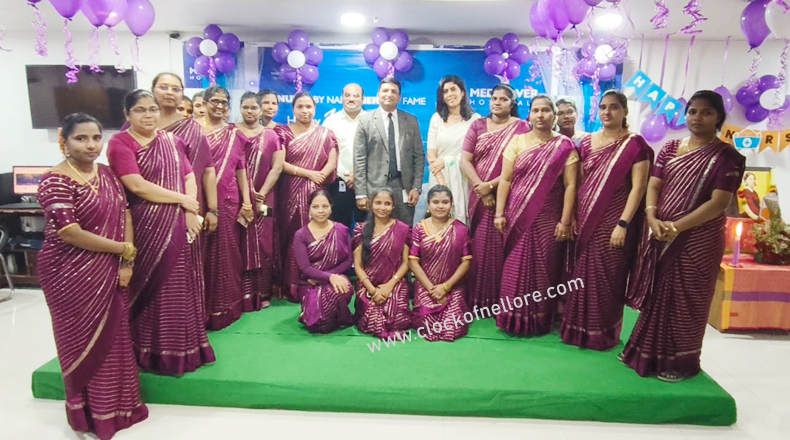Clock Of Nellore ( Nellore ) – నెల్లూరులోని మెడికవర్ హాస్పిటల్ లో అంతర్జాతీయ నర్సుల దినోత్సవం బుధవారం ఘనంగా జరిగింది. హాస్పిటల్ సెంటర్ హెడ్ డాక్టర్ ధీరజ్ రెడ్డి ఆధ్వర్యంలో నిర్వహించిన ఈ వేడుకల్లో మెడికల్ సూపరింటెండెంట్ డాక్టర్ యశ్వంత్ రెడ్డి, నర్సింగ్ విభాగం హెడ్ శైలజ, ఇతర విభాగాల అధిపతులు, నర్సింగ్ సిబ్బంది పాల్గొన్నారు. ఇందులో భాగంగా నర్సులతో కలిసి హాస్పిటల్ సెంటర్ హెడ్ డాక్టర్ ధీరజ్ రెడ్డి, డాక్టర్ యశ్వంత్ రెడ్డి కేక్ కట్ చేసి నర్సుల దినోత్సవ శుభాకాంక్షలు తెలియజేశారు. అనంతరం వారు మాట్లాడుతూ రోగికి చికిత్స మొదలైనప్పటి నుండి తిరిగి వారు కోలుకుని డిశ్చార్జ్ అయ్యే వరకూ రోగి వెన్నంటే ఉండి సేవలు చేసే నర్సులు దైవంతో సమానమని కొనియాడారు. అనుక్షణం నర్స్, సిస్టర్ అని రోగులు పిలుస్తున్నా విసుగు చెందకుండా ఆరోగ్య వ్యవస్థకు వెన్నెముకగా ఉండే వారే నర్సులని గుర్తు చేశారు. వారి సేవలను వెలకట్టలేమని ప్రసంశించారు.