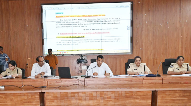 Clock Of Nellore ( Nellore ) – రోడ్డు ప్రమాదాల నుంచి ప్రజల ప్రాణాలను కాపాడడమే లక్ష్యంగా రోడ్డు ప్రమాదాల నివారణా చర్యలను సత్వరమే చేపట్టాలని నెల్లూరు జిల్లా కలెక్టర్ హిమాన్షు శుక్ల అధికారులకు సూచించారు. గురువారం నెల్లూరు కలెక్టరేట్లోని తిక్కన ప్రాంగణంలో రోడ్డు భద్రత కమిటీ సమావేశాన్ని జిల్లా కలెక్టర్ హిమాన్షు శుక్ల, ఎస్పీ డాక్టర్ అజిత వేజండ్ల నిర్వహించారు. ఈ సందర్భంగా కలెక్టర్ మాట్లాడుతూ రోడ్డు ప్రమాదాలను అరికట్టడం, ప్రజలకు ట్రాఫిక్ నిబంధనల పట్ల అవగాహన కల్పించేందుకు ప్రత్యేక దృష్టి పెట్టాలని కమిటీలోని అధికారులకు సూచించారు. రాంగ్ రూట్ లో వచ్చే ప్రయాణికులపై కఠిన చర్యలు తీసుకొని, వాహనాలను సీజ్ చేయాలని పోలీస్ అధికారులను ఆదేశించారు. గత సమావేశంలో చర్చించిన విధంగా జిల్లాలో తరచూ ప్రమాదాలు జరిగే ప్రాంతాల్లో ఎన్హెచ్ అధికారులు చాలా వరకు నివారణ చర్యలు చేపట్టారని అభినందించారు. ఇంకా అవసరమైన చోట స్పీడ్ బ్రేకర్లు, రేడియం పెయింటింగ్ వేయాలని సూచించారు. నెల్లూరు – కృష్ణపట్నం రోడ్డు మార్గంలో స్పీడ్ బ్రేకర్లు, పనులు వేగంగా పూర్తి చేయాలి అన్నారు. అన్ని మార్గాల్లో కూడా విద్యుత్ లైట్లు పనిచేసేలా చర్యలు తీసుకోవాలని మున్సిపల్ కమిషనర్ కు సూచించారు. నెల్లూరు ఆర్టీసీ బస్టాండు వద్ద లోపలికి వెళ్లేటప్పుడు, బయటకు వచ్చేటప్పుడు బస్సులు నిలపకుండా చర్యలు తీసుకోవాలని ఆర్టీసీ అధికారులను ఆదేశించారు.